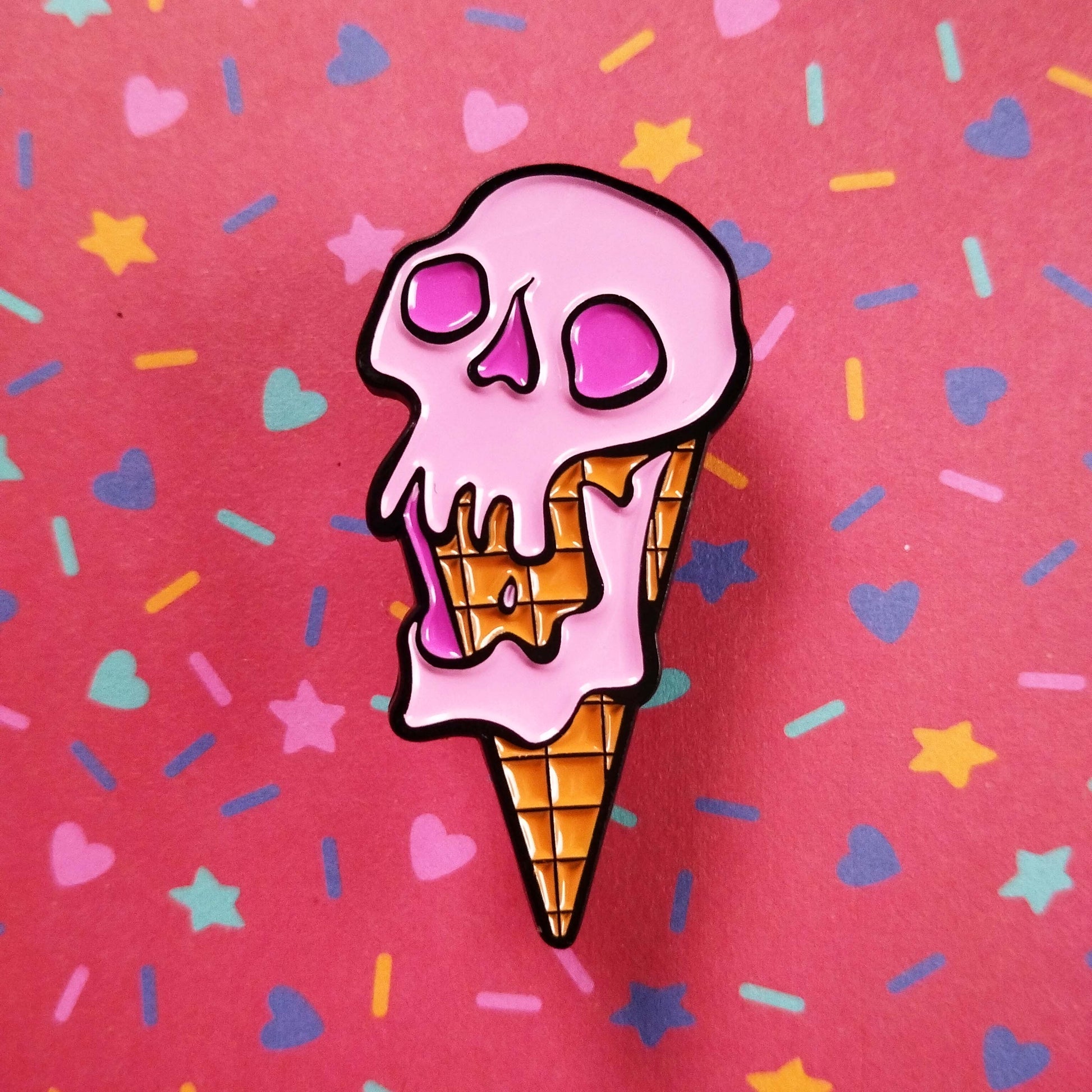 hey quick question, why am i getting portents of doom in my ice cream cone? a 1.8 inch soft enamel pin depicting a melting skull ice cream cone.
